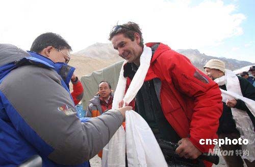 5月9日,在親眼目睹了奧運圣火在珠峰傳遞的盛舉后,6家受邀的境外媒體的記者離開珠峰大本營絨布新聞中心,將奔赴北京。境外記者、北京奧組委的官員和工作人員、受邀的境內記者和本次活動的組織者道別,西藏自治區黨委宣傳部常務副部長、珠峰新聞中心主任沈開運前來送行。圖為工作人員向境外記者獻上了潔白的哈達。中新社發 盛佳鵬 攝