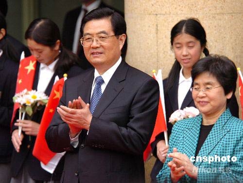 5月9日下午,正在日本進行國事訪問的中國國家主席胡錦濤及夫人劉永清參觀了橫濱山手中華學校,受到該校全體師生的熱烈歡迎。圖為胡錦濤夫婦在歡迎儀式上。中新社發 朱沿華 攝