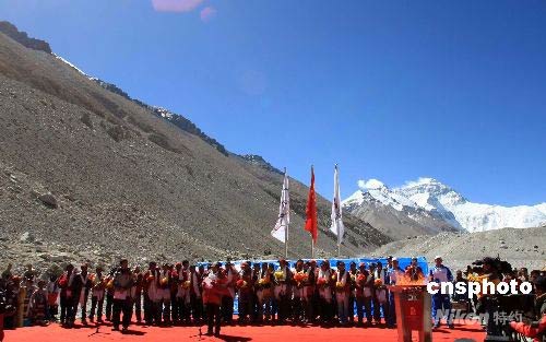 北京奧運火炬接力珠峰傳遞中國登山隊凱旋慶祝儀式在珠峰大本營舉行。中新社發(fā) 盛佳鵬 攝