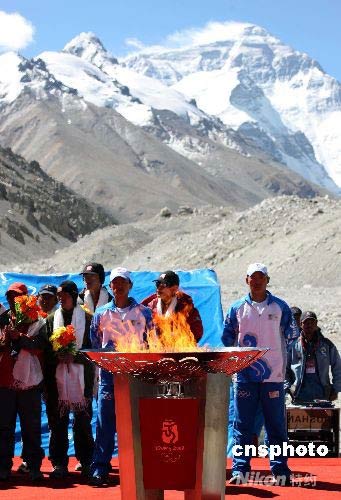 圖為在珠峰腳下熊熊燃燒的高原圣火臺。 中新社發 盛佳鵬 攝