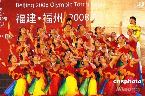 5月11日晚,為慶祝奧運圣火福州傳遞圓滿成功,北京奧運會火炬接力境內傳遞福建福州站慶典儀式文藝晚會在福州望龍臺公園舉行。中新社發 劉可耕 攝