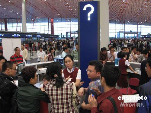 5月12日四川汶川的大地震,造成成都航線停飛,重慶航線臨時中斷,乘客紛紛到首都機場問訊處打探航班消息。 中新社發 鄒憲 攝