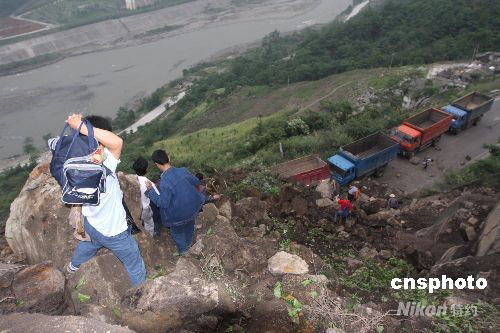 5月12日14時28分,四川汶川縣(北緯31度,東經103.4度)發生7.8級地震,離都江堰市區5公里的水井灣大橋發生大面積塌方,通往汶川的道路全線阻擋。圖為困在塌方區域的居民前往安全區域。 中新社發 黃榮 攝