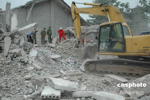 12日下午2:30左右,受四川汶川地震波及,重慶市梁平縣文化鎮(zhèn)一小學教學樓發(fā)生垮塌。13日凌晨1時許,搜救工作已全部結(jié)束,垮塌造成5人死亡,36人受傷。圖為挖掘機正在垮塌小學廢墟上進行挖掘。 中新社發(fā) 郭虹 攝