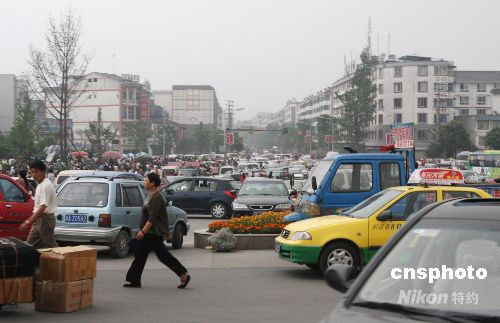 5月12日14時28分,四川汶川縣(北緯31度,東經103.4度)發生7.8級地震。圖為受災嚴重的都江堰市區居民紛紛出來避險,造成車輛堵塞。中新社發 黃榮 攝