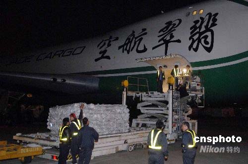 五月十三日深夜,深圳航空旗下的中德合資翡翠航空大型貨機(jī)JI7452受命緊急運(yùn)輸救災(zāi)物資,四千頂帳篷從天津?yàn)I海機(jī)場(chǎng)連夜裝機(jī)起運(yùn),專機(jī)運(yùn)往四川地震災(zāi)區(qū)。中新社發(fā) 陳文 攝