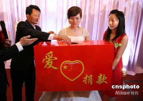 新娘邱媛媛和新郎饒新的家人在婚禮現場向四川災區捐贈2萬元人民幣。中新社發 鐘山 攝