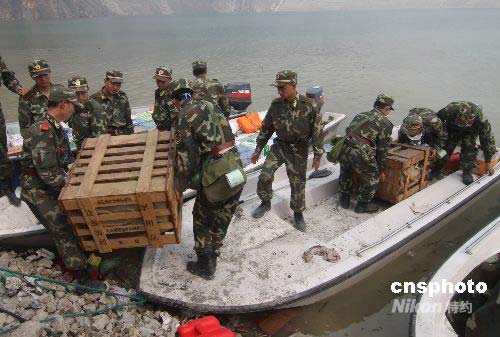 解放軍和武警官兵在搬運沖鋒舟上的救災物資。中新社發 郭國權 攝