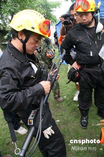 圖為救援隊(duì)員在調(diào)試視像探測(cè)器。中新社發(fā) 齊彬 攝