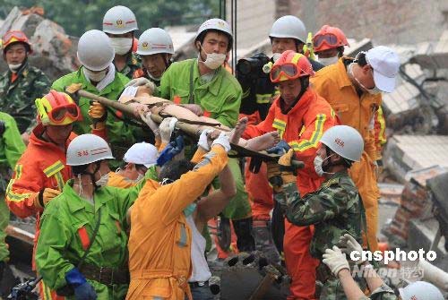 5月17日,上海公安消防救援隊(duì)在四川映秀鎮(zhèn)映秀灣發(fā)電廠的映電賓館廢墟里,發(fā)現(xiàn)有生命跡象。經(jīng)過10個(gè)多小時(shí)的緊張營救,終于在18時(shí)15分將20歲的蔣雨航成功救出,他在廢墟里存活了124個(gè)小時(shí),其父母也在當(dāng)日下午從貴州趕到現(xiàn)場。中新社發(fā) 盛佳鵬 攝