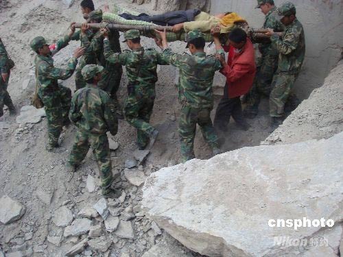 5月18日,成都軍區駐渝某集團軍紅軍師步兵團在汶川大地震茂縣懸崖峭壁的羌寨,冒著余震塌方解救兩位女傷員,傍晚成功送到前來支援的解放軍第二軍醫大學醫療隊。中新社發 賈國榮 攝