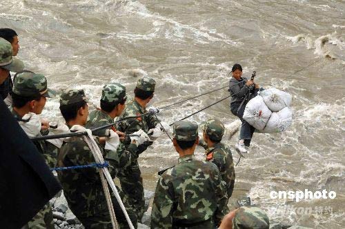 5月19日上午,武警駐四川某師部分官兵在地震重災區汶川縣綿箎岷江營救轉移地震災民35名。中新社發 陳文 攝