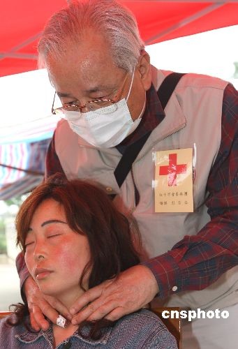 5月21日下午,臺灣紅十字醫療隊在四川省廣漢市高坪鎮災民安置中心安營扎寨開展醫療救治。78歲的原臺北市醫師工會理事長彭芳谷先生在高坪鎮中心醫院緊急搶救一名在地震中受重傷產生“氣胸”的中年女患者,并指導醫療隊醫生為期實施外科手術。中新社發 任晨鳴 攝