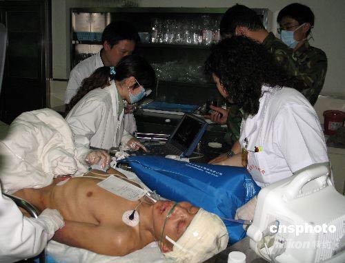 5月21日,四川省綿竹縣被埋8天8夜零4小時(196個小時)的天池煤礦礦工賴元平被救出,經(jīng)解放軍255醫(yī)院醫(yī)療隊急救后由成都軍區(qū)直升飛機(jī)接至成都軍區(qū)總醫(yī)院救治。傷者在該院作CT檢查時被發(fā)現(xiàn)腦有內(nèi)巨大血腫,時刻有生命危險,成都軍區(qū)總醫(yī)院顧建文副院長和解放軍301總醫(yī)院周定標(biāo)教授研究后決定立即手術(shù)。手術(shù)由顧建文副院長主刀,1小時40分鐘后手術(shù)完成,術(shù)后傷員生命體癥平穩(wěn)。中新社發(fā) 朱琥姚遠(yuǎn) 攝