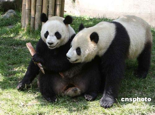 5月23日,準備贈送給臺灣的大熊貓團團和圓圓,在四川汶川大地震后的臥龍大熊貓保護區內無憂無慮地戲耍。中新社發 任晨鳴 攝