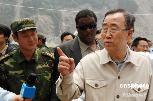 5月24日,聯合國秘書長潘基文乘直升機抵達四川汶川映秀鎮察看災情。中新社發 趙振清 攝