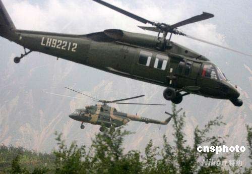 5月22日,陸航黑鷹和米-17直升機空降帳篷等救災急需物資到受災嚴重的高山羌寨。中新社發 賈國榮 攝