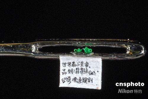 5月28日,臺灣著名微雕藝術家陳逢顯展示其微雕新作——“世界最小茶壺”。圖中的茶壺系用翡翠綠顏色寶石的粉末,雕刻出供藝術觀賞的茶壺。比針孔還要小得多,需透過高倍顯微鏡才能觀賞。陳逢顯“世界最小茶壺系列”的部分作品,現(xiàn)正在坪林茶葉博物館展出。中新社發(fā) 陳立宇 攝