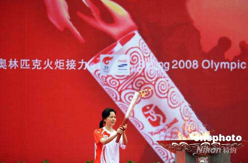 5月28日,合肥籍武術項目世界冠軍范雪平點燃奧運火炬傳遞合肥站結束儀式上的圣火盆。中新社發 廖攀 攝