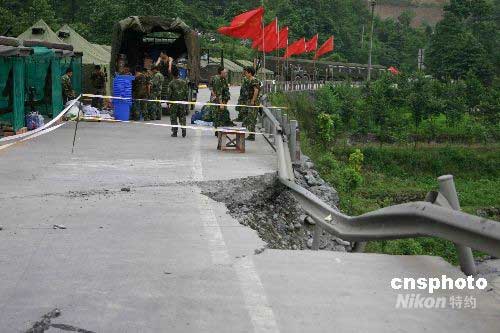 “5.12”四川汶川大地震中,彭州小魚洞大橋被震斷,已不能通行。圖為5月28日,濟南軍區(qū)官兵在大橋兩側警戒。中新社發(fā) 楊杰 攝