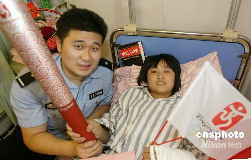 田野,是南京市公安局華僑路派出所的一名民警,也是北京奧運會的火炬手。5月29日,他和他的同事帶著奧運火炬來到江蘇省人民醫院愛心病房,看望6位在四川地震中受災的孩子,讓他們近距離的看到了“祥云”火炬,并告訴他們在火炬傳遞中大家對災區的祝愿。中新社發 吳俊 攝