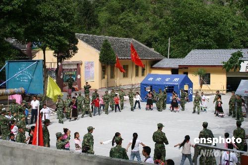 5月29日,“六一”兒童節(jié)前夕,四川省平武縣木座藏族鄉(xiāng)中心小學(xué)學(xué)生和駐扎在木座藏族鄉(xiāng)的濟南軍區(qū)某紅軍團官兵一起聯(lián)歡。5月16日,這個紅軍團從湖北省孝感縣千里機動來到這里,官兵們顧不上休息就展開救援工作。木座藏族鄉(xiāng)的十幾個村小組,分布在700多平方公里的山谷大川中,官兵們分成30多個搜救小分隊,深入到各個山溝村寨營救幸存者、拆除危房、搭建帳篷小學(xué)、設(shè)立救助站,使1700多人有了溫馨的家。圖為紅軍團官兵與木座藏族鄉(xiāng)中心小學(xué)師生跳起 “團結(jié)舞”。中新社發(fā) 虞平 攝