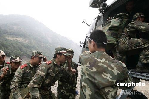 5月31日,在唐家山堰塞湖堤壩壩頂,施工的部隊官兵正乘直升機陸續撤退。他們預計在6月1日12點前全部撤退,但具體情況要根據天氣而定。中新社發 杜洋 攝