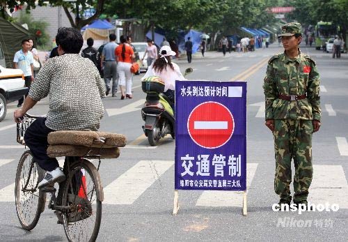 5月31日,唐家山堰塞湖避險疏散預案三分之一潰壩方案涉及的下游群眾,已全部撤離到安全地帶。圖為安置疏散民眾的綿陽市游仙區綿山路實行交通管制。中新社發 毛建軍 攝