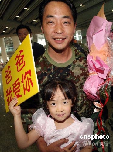 女童高舉“爸爸我愛你”迎接參加抗震救援的父親
