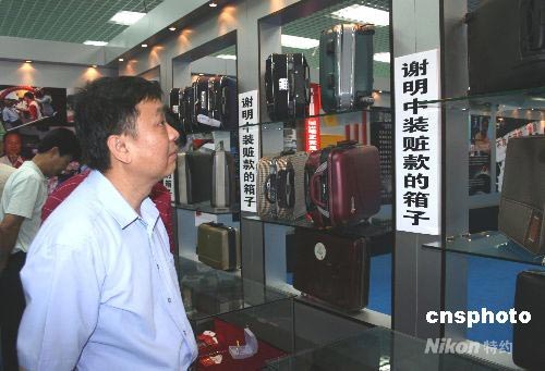 六月三日,?陂_幕的2008海南反腐倡廉警示教育展覽,展出原海南省委委員、文昌市委書記謝明中裝贓款的十八只箱子,以及價值四十萬元人民幣的滿天星手表等贓物。謝明中在擔任文昌市委書記期間,利用職權,在工程審批、資金安排、干部提拔等方面為他人謀取利益,大量收受或索取賄賂,還與多名女性發生不正當男女關系。海南省紀委共查獲謝明中轉移或藏匿的賬款折合人民幣兩千五百余萬元,另有金銀首飾等物品十七件。中新社發 關向東 攝