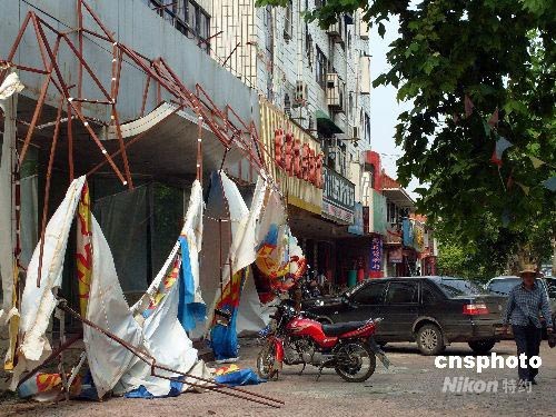 枝江城區遭受風災,部分電線桿被刮倒,枝江全城停電。中新社發 劉君鳳 攝