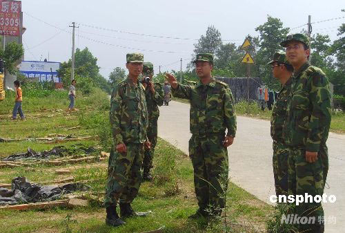 唐家山堰塞湖對綿陽市境內的蘭成渝輸油管道大動脈形成重大威脅,6月4日,成都軍區一舟橋部隊的600余名官兵已迅速抵達江油市九嶺鎮,對該輸油管道進行搶險保通任務。中新社發 霍潺 攝