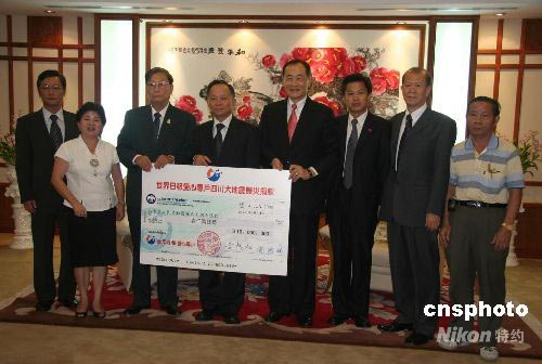 泰國華文報紙《世界日報》社社長黃根和(右四)、臺胞僑社代表及愛心讀者代表二十多人,六月四日來到中國駐泰國大使館,轉交《世界日報》“捐助四川地震愛心專戶”募集的一千萬泰銖捐款。中國駐泰大使張九桓(左四)接受捐款,感謝《世界日報》及其愛心讀者對汶川地震災區人民的關注和支持,并表示將盡快把捐款轉交災區人民。黃根和社長表示,《世界日報》啟動“愛心專戶”后,很快引起泰國社會各界的積極響應,旅泰華人紛紛慷慨解囊,獻出一份愛心,希望災區人民能夠早日度過難關,重建家園。中新社發 顧時宏 攝