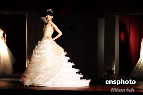 周大福“昔今.飾金”珠寶藝術展覽近日在香港文化博物館劇院舉辦了隆重的揭幕典禮。代言人呂燕與樂基兒、林嘉綺三位中港臺頂尖名模,身著奧斯卡美術指導獎得主葉錦添先生設計的配套婚紗,傾情演繹了周大福最新婚嫁珠寶作品。葉錦添先生從各自獨特的角度,通過婚嫁首飾與婚紗這兩種重要的婚禮元素,闡述著他們對于現代女性復雜而多變的情感世界的理解與領悟,表達出新人對美麗與幸福的無限憧憬與期冀。 中新社發 楊影懿 攝
