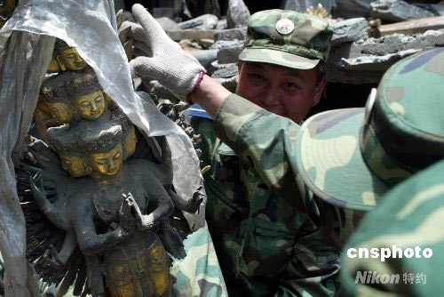 6月4日,在四川理縣執行救災任務的成都軍區空軍雷達某團官兵為甘堡藏寨景區搶救出佛像等大小文物十二件。地處理縣的守備官寨寺院有著數百年的歷史,不但具有極其重要的文物價值,更一直是當地藏族同胞的“精神家園”。圖為官兵們從廢墟中搶救出有上百年歷史的珍貴的千手觀音佛像。中新社發 李耀 攝