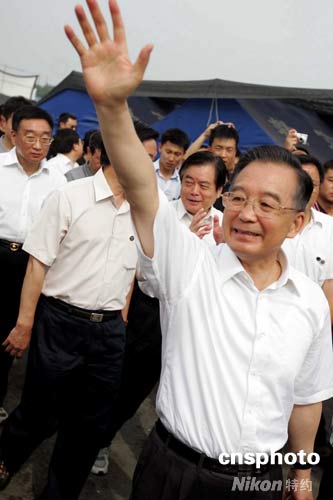 6月6日,國(guó)務(wù)院總理溫家寶到四川綿陽(yáng)涪城區(qū)疏散安置點(diǎn)慰問(wèn)受災(zāi)民眾。 中新社發(fā) 杜洋 攝