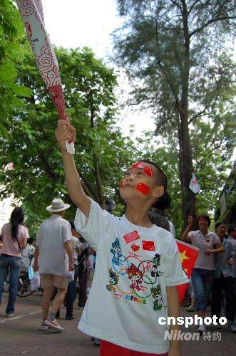 一名少年高舉自制奧運(yùn)“祥云”火炬喜迎圣火。中新社發(fā) 劉萬強(qiáng) 攝