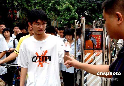 參加首日高考的福州考生步入福州銅盤中學(xué)考點時,主動出示準考證和身份證。中新社發(fā) 劉可耕 攝