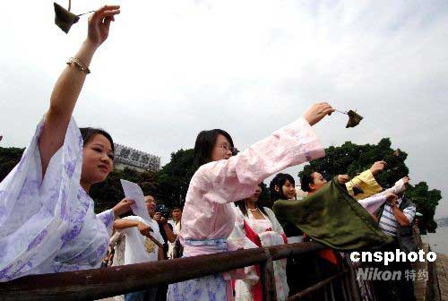 眾多身著傳統漢服的福建青年女子紛紛向閩江投粽子,端午時節祭悼屈原。中新社發 劉可耕 攝