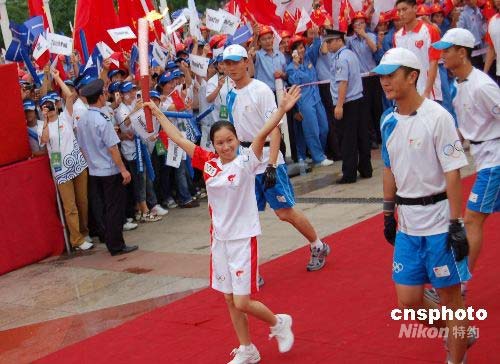6月8日上午,北京奧運火炬在革命老區廣西百色平果縣進行傳遞,第一棒火炬手是平果縣希望小學校長、壯族姑娘周標亮,她曾受到鄧小平的資助。上世紀九十年代,鄧小平以“一個老共產黨員”的名義向希望工程捐款5000元,這筆捐款被落實到平果縣希望小學,使25名瀕臨失學的貧困學生得以繼續學業,周標亮就是當年得到資助的學生之一。后來,這位壯族姑娘考取了一所師范學校,畢業后她回到培養自己的平果縣希望小學任教,2005年被任命為該校校長。中新社發 劉萬強 攝