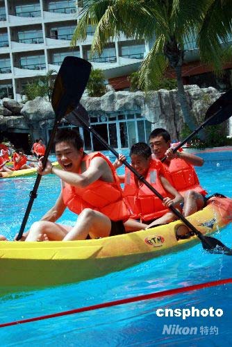 孩子們在三亞山海天大酒店參加賽龍舟比賽。中新社發 關向東 攝