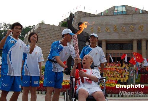 6月8日下午,奧運圣火在廣西百色市傳遞,當地年齡最大的火炬手、九十二歲的老紅軍牟一琳坐在輪椅上,在百色起義紀念館前舉起了“祥云”火炬。百色是鄧小平軍事生涯的起點,一九二九年鄧小平在百色領導發動了著名的百色起義。中新社發 劉萬強 攝