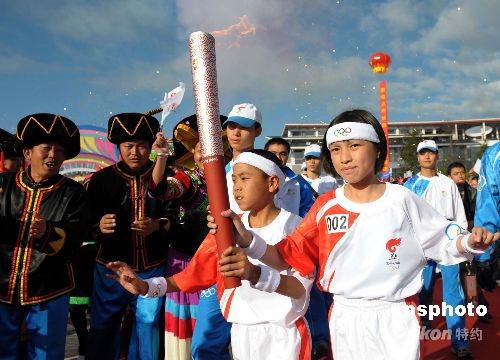 6月10日,奧運圣火在云南麗江開始傳遞,四川汶川地震孤兒張紫蘭(右)與云南麗江地震孤兒和震生共同傳遞首棒火炬。1996年,云南麗江曾發生7級地震。中新社發 廖攀 攝