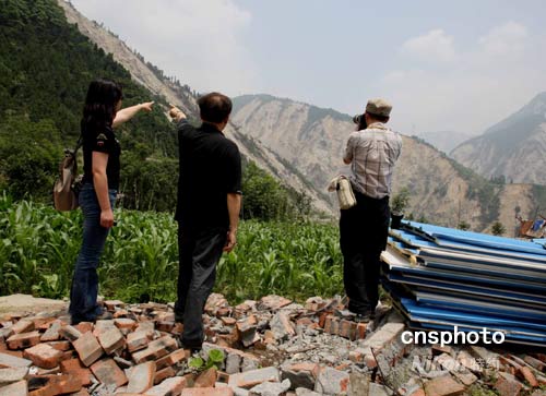 失事直升機(jī)殘骸10日晨在四川汶川映秀鎮(zhèn)3511高地(當(dāng)?shù)卮迕穹Q“火燒杠”)被發(fā)現(xiàn),圖為記者遙望四川省軍區(qū)司令員率部趕赴的山頭。中新社發(fā) 賈國(guó)榮 攝