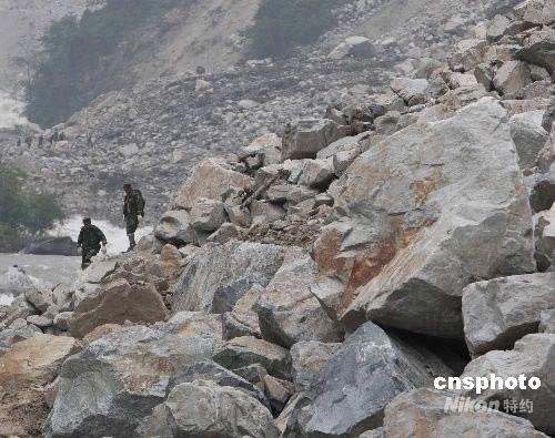 參加搜救的四川省軍區部隊繼續增援山高林密非常險峻的失事地點,準備運送遺體。中新社發 賈國榮 攝