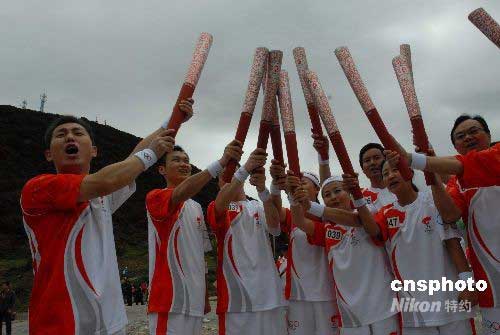在圣火傳遞結束儀式的現場,已經傳遞完成的10余位火炬手高舉祥云火炬齊聲為中國加油,祝福北京奧運。 中新社發 石雨 攝