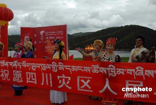奧運圣火在云南香格里拉傳遞,在結束儀式現場,全場共同高歌《一個媽媽的女兒》,為四川災區人民祝福。 中新社發 石雨 攝
