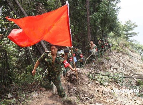 6月13日,四川省三個軍分區的一千多名預備役官兵繼續從映秀鎮緊急趕赴失事直升機警民遺體營地,他們將運送全部失事直升機遇難者遺體下山。中新社發 賈國榮 攝