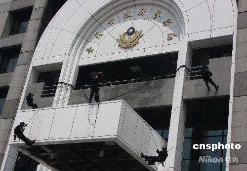 臺北市政府警察局十三日舉辦慶祝警察節活動,安排安排平日難得一見的特勤中隊表演戰技操演,隊員們全副武裝直接從警察局十三樓樓頂一路攀降而下,這也是臺北市警局大樓首次出現的高樓特警攀降表演。中新社發 耿軍 攝