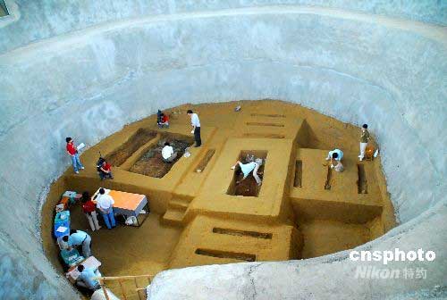 2008年6月15日,安徽省蚌埠市雙墩一號(hào)墓發(fā)掘現(xiàn)場(chǎng)。從2006年12月開(kāi)始,安徽省文物考古研究所展開(kāi)對(duì)雙墩1號(hào)墓的發(fā)掘,目前已接近尾聲。據(jù)考古專家論證,春秋時(shí)期鐘離國(guó)在安徽省蚌埠和鳳陽(yáng)一帶,今天的“鐘離”和“鐘”姓,一說(shuō)即來(lái)源于該國(guó)。鐘離國(guó)是春秋時(shí)期的一個(gè)小國(guó),蚌埠雙墩一號(hào)墓位于“鐘離城”遺址不遠(yuǎn),從墓葬規(guī)模和陪葬物品等種種跡象表明,這個(gè)奇特的超級(jí)大墓,極有可能就是當(dāng)時(shí)鐘離國(guó)的國(guó)君。目前發(fā)掘工作仍在進(jìn)行。中新社發(fā) 從啟 攝